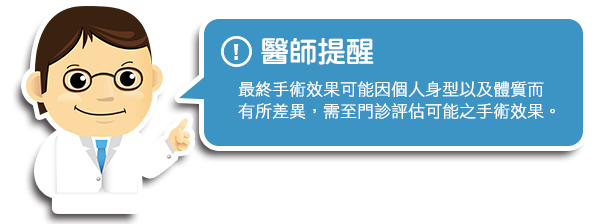 【提 醒】行政院衛生福利部公告:「『美容醫學』一般係指由專業醫師透過醫學技術,如:手術、藥物、醫療器械、生物科技材料等,執行具侵入性或低侵入性醫療技術 來改善身體外觀,而『非以治療疾病為主要目的』」。本宣傳由合格醫師透過醫學技術執行具低侵入性醫療技術來「改善」身體外觀,依據行政院衛生福利部衛署醫 字0990262180號、衛部醫字第1031662939號辦理,屬於仿單核准適應症外的使用(Off-label use),醫師應確實告知使用原因及可能造成的風險,並取得其同意始得使用;有關適應症、禁忌症等副作用等問題,醫師將依個案說明。
